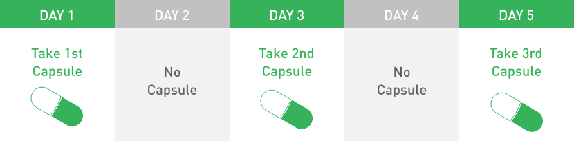 Oral administration with 3 capsules over 5 days, each to be taken approximately 1 hour before a meal with cold or lukewarm water
